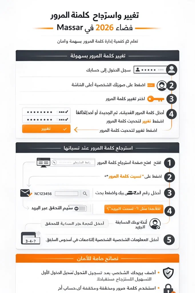إذا أردت تجربة “بدون توتر” مع مسار متمدرس 2026، فاحرص عند استخدام مسار متمدرس على الدخول من الروابط الرسمية فقط، وتفعيل وسائل الاسترجاع داخل الحساب، ومراقبة النقط مادةً بمادة، والاحتفاظ بنسخة عند كل تحديث مهم. بهذه الخطوات تصبح المنصة أداة تنظيم وتخطيط دراسي—وليس مجرد مكان لمفاجآت النتائج.